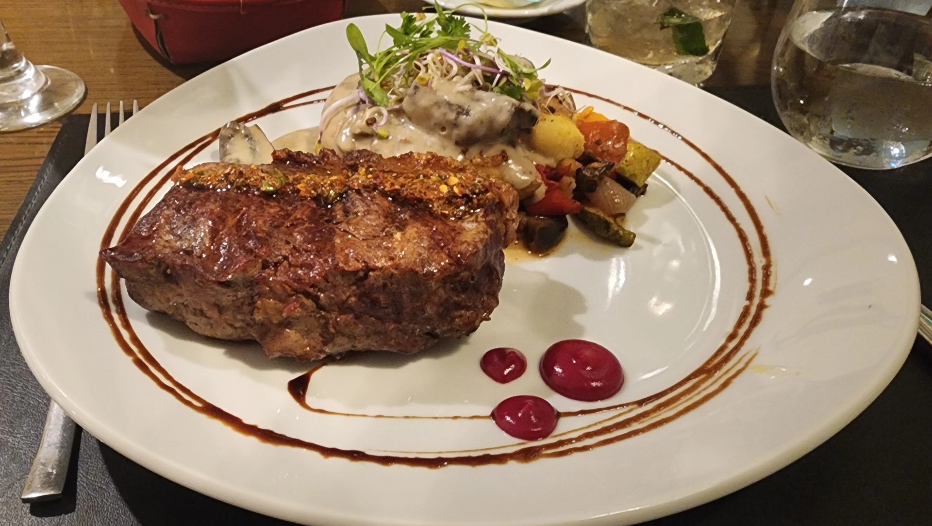 Para los principales se optó por la Bisteca di chorizo; un bife de chorizo, cocido al punto solicitado, acompañado de papa a la plancha, crema de hongos y ciambotta de vegetales, y por el Salmone rosa con mousse de avocado y fritatta, un salmón tierno y jugoso, acompañado de fritatta de espárragos y puerros cuya suavidad realza el ligero amargor de los vegetales, completando un plato delicioso y equilibrado. Los platos son abundantes, y si la experiencia se comparte con más comensales, permite probar varias opciones de la carta y disfrutar de la diversidad de la propuesta.